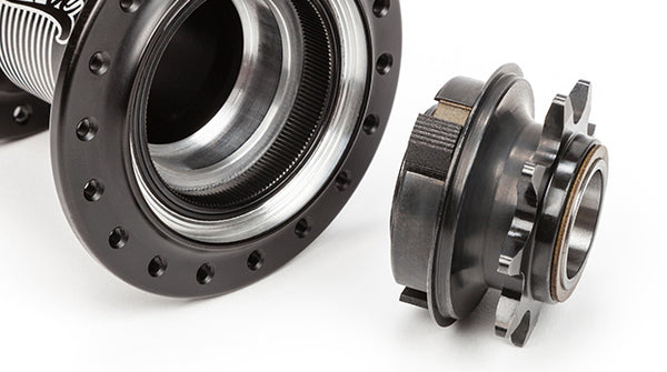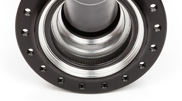 Utilizing a 150 tooth ratchet ring which is matched to a custom driver, the pedal gap on the Swerve hub is almost non-existent.