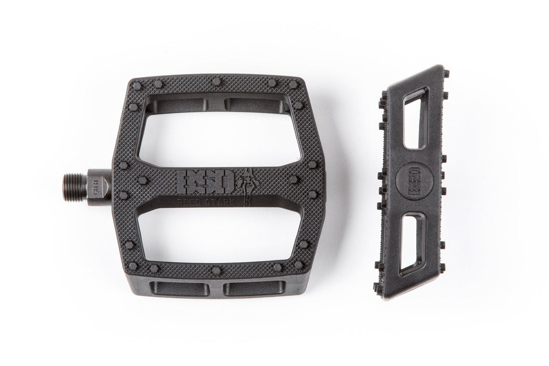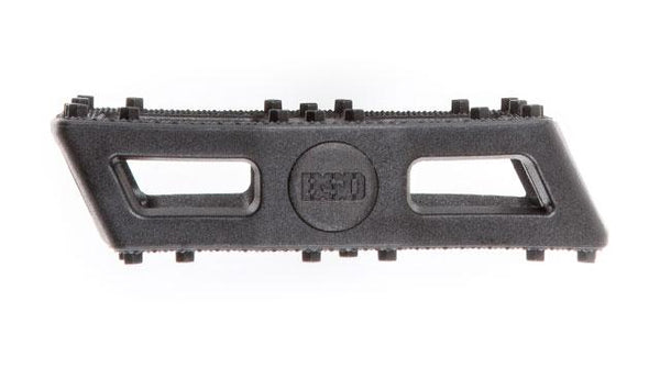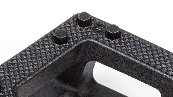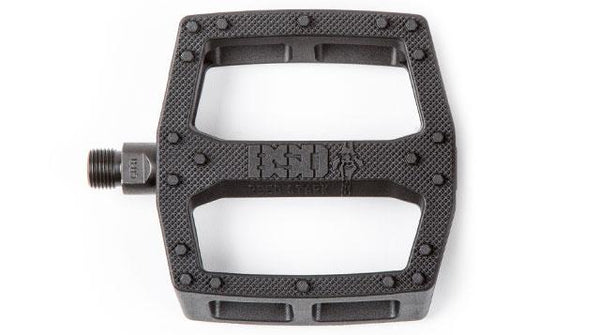 Reed Stark has been talking about this pedal idea since he joined BSD. He noticed that when a bike falls, the corner pins on plastic pedals often grind down and break off. The Safari pedal is designed with extra pins in these high-impact areas to ensure it stays grippy even after severe abuse. Optimal pin placement, hexagonal pin shape, and knurling all combine to make this one of the most durable and effective plastic pedals on the market.